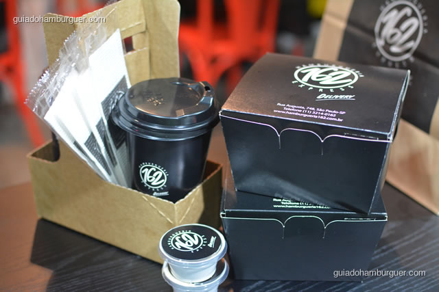 As bebidas não foram esquecidas, para isso a Hamburgueria 162 Express desenvolveu copos que vão fechados dentro de um engradado de papelão, ótimo para ser transportado.