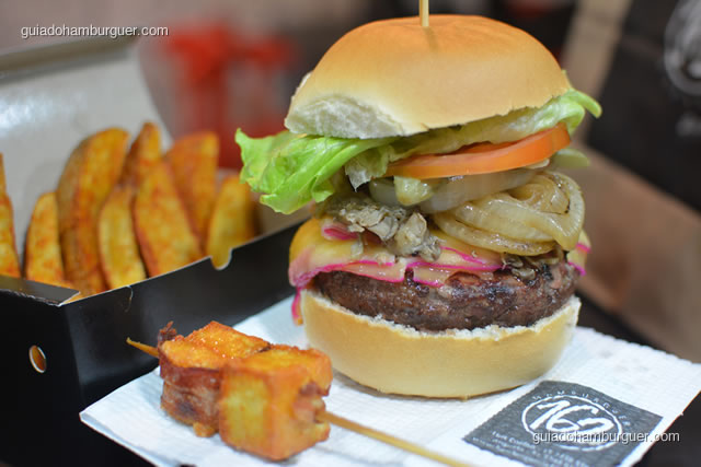 Pão de hambúrguer tradicional, hambúrguer artesanal bovino, shimeji grelhado, queijo gouda, salada (picles e cebola tostada) e acompanhado de espeto de queijo coalho envolto em pancetta e melaço de cana.