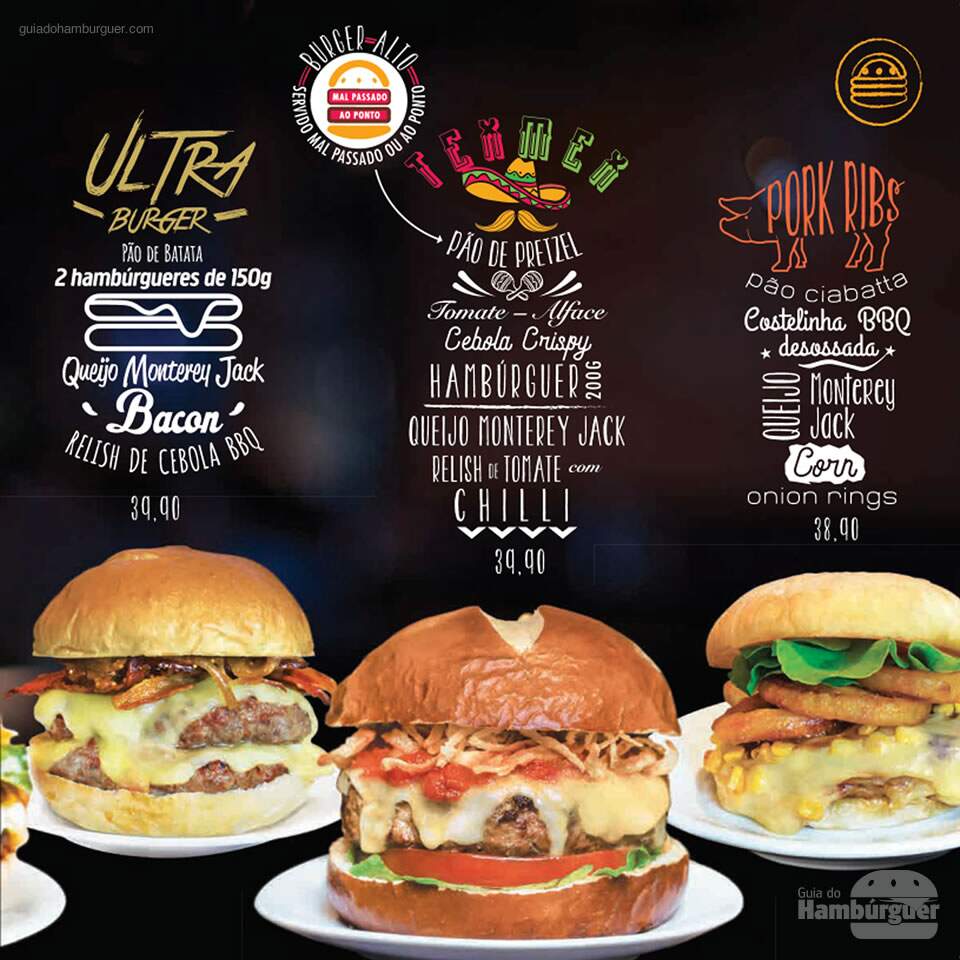O ultra Burger é com certeza um dos mais pedidos da casa, combina duas carnes de 150g, queijo Monterey Jack, bacon e relish de cebola no molho barbecue por R$ 39,90.